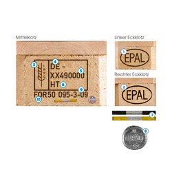 - Gemäß ISPM 15 behandelte EPAL Europaletten erkennt man an den Einbränden auf beiden Mittelklötzen der Längsseite.