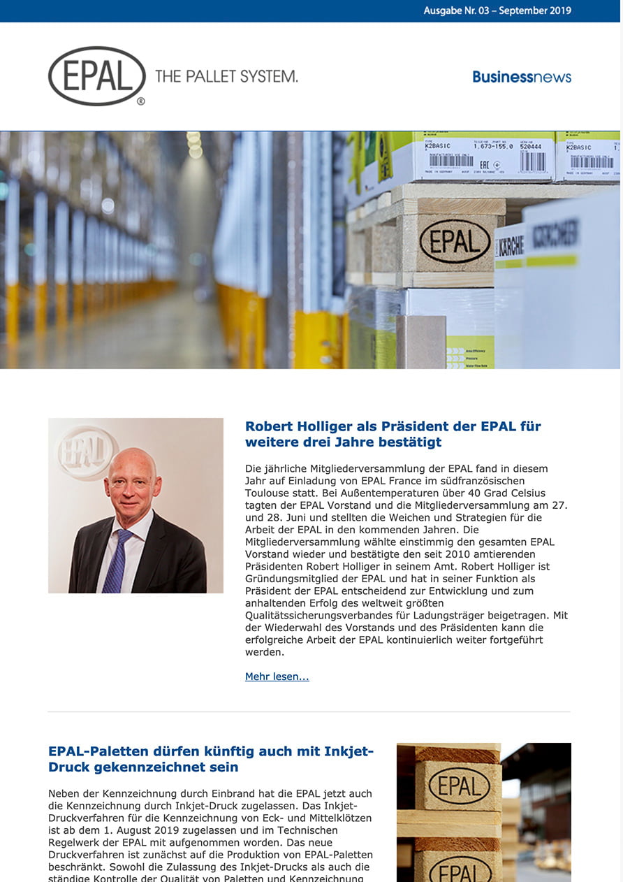 Düsseldorf, den 24. Juli 2019 – Die Mitgliederversammlung der European Pallet Association e.V. (EPAL) hat am 28. Juni im französischen Toulouse den amtierenden Präsidenten Robert Holliger sowie den gesamten Vorstand der EPAL einstimmig für weitere drei Jahre im Amt bestätigt. Robert Holliger ist Gründungsmitglied der EPAL und seit 2010 Präsident des internationalen Dachverbandes für…