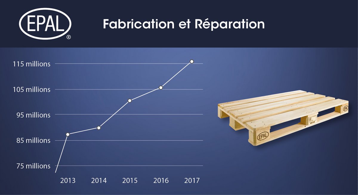 Le nombre des fabrications a augmenté de 9,7 % pour atteindre 88,3 millions de palettes EPAL fabriquées. Quant au nombre des réparations, il s’élève à 27,5 millions et a enregistré une hausse de 10 % par rapport à l'année précédente.