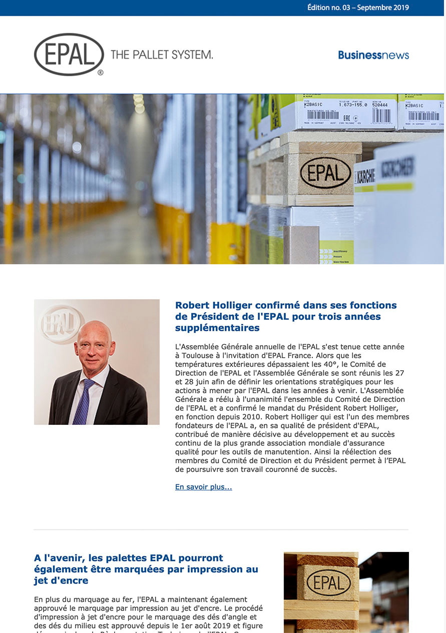 Düsseldorf, le 24 juillet 2019 – L'Assemblée Générale de l’European Pallet Association (EPAL) a réélu à l'unanimité, le 28 juin à Toulouse, le Président sortant Robert Holliger et l'ensemble des membres du Comité de Direction de l'EPAL pour un nouveau mandat de trois ans.