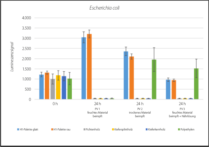 In the laboratory investigations carried out between February 2018 and December 2019, the microbial properties of standard EPAL Euro pallets were compared to H1 plastic pallets. Pallet types of all available quality classes were tested strictly according to certified inspection procedures. The test pieces were ordered from a dealer from the normal load carrier sector, so they had all already been used once or more. They were not cleaned before testing. Tests were carried out with the test germs escherichia coli and staphylococcus aureus.
